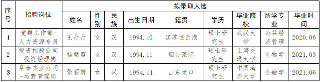 按照2020年8月28日發(fā)布的《2020年煙臺財金集團面向“雙一流”和全球TOP200高校畢業(yè)生公開招聘簡章》相關(guān)規(guī)定,經(jīng)過簡歷收集、資格審查、初試、復(fù)試、集體決策等環(huán)節(jié),擬確定部分崗位錄取人選(詳見下表),現(xiàn)予以公示,公示期為5個工作日(11月10日至11月17日)。