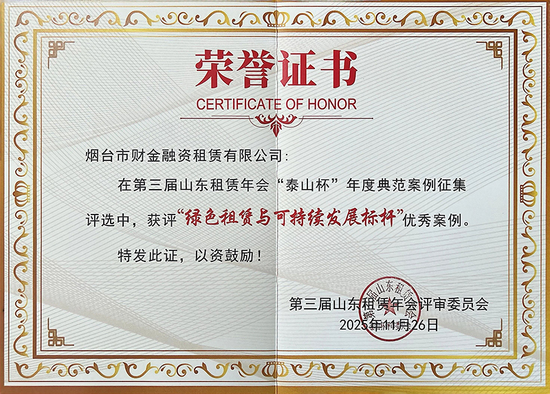 近日,煙臺(tái)財(cái)金集團(tuán)旗下財(cái)金融資租賃有限公司在第三屆山東租賃年會(huì)“泰山杯”年度典型案例評(píng)選中,喜獲“綠色租賃與可持續(xù)發(fā)展標(biāo)桿案例”榮譽(yù)稱號(hào)。